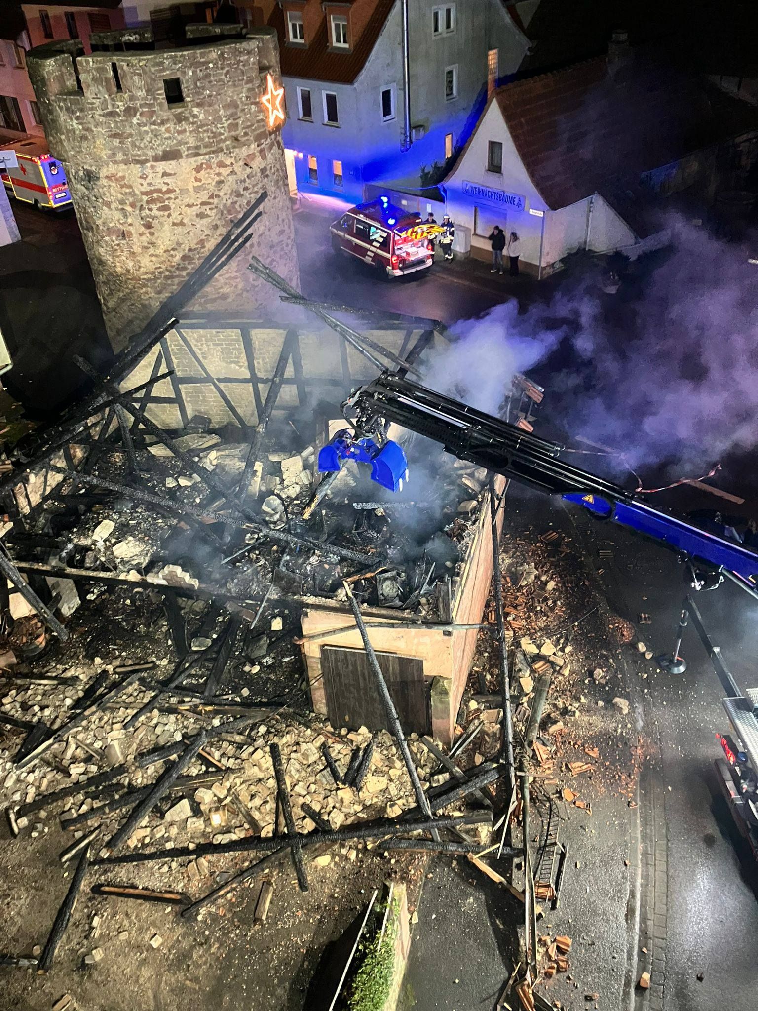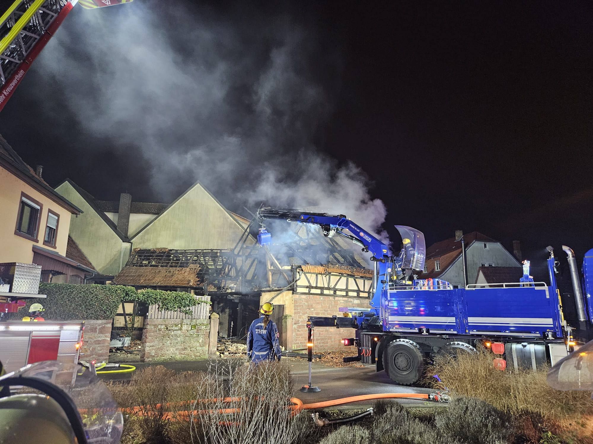Dieses sehr gut koordinierte Vorgehen zeigte den gewünschten Erfolg und alle angrenzenden Gebäude konnten gehalten werden. Es wurde das THW Marktheidenfeld mit ihrem Fachberater und dem Kranfahrzeug hinzugezogen. Dieses brach die einsturzgefährdete Scheune kontrolliert ab, so dass abschließende Nachlöscharbeiten durchgeführt werden konnten.