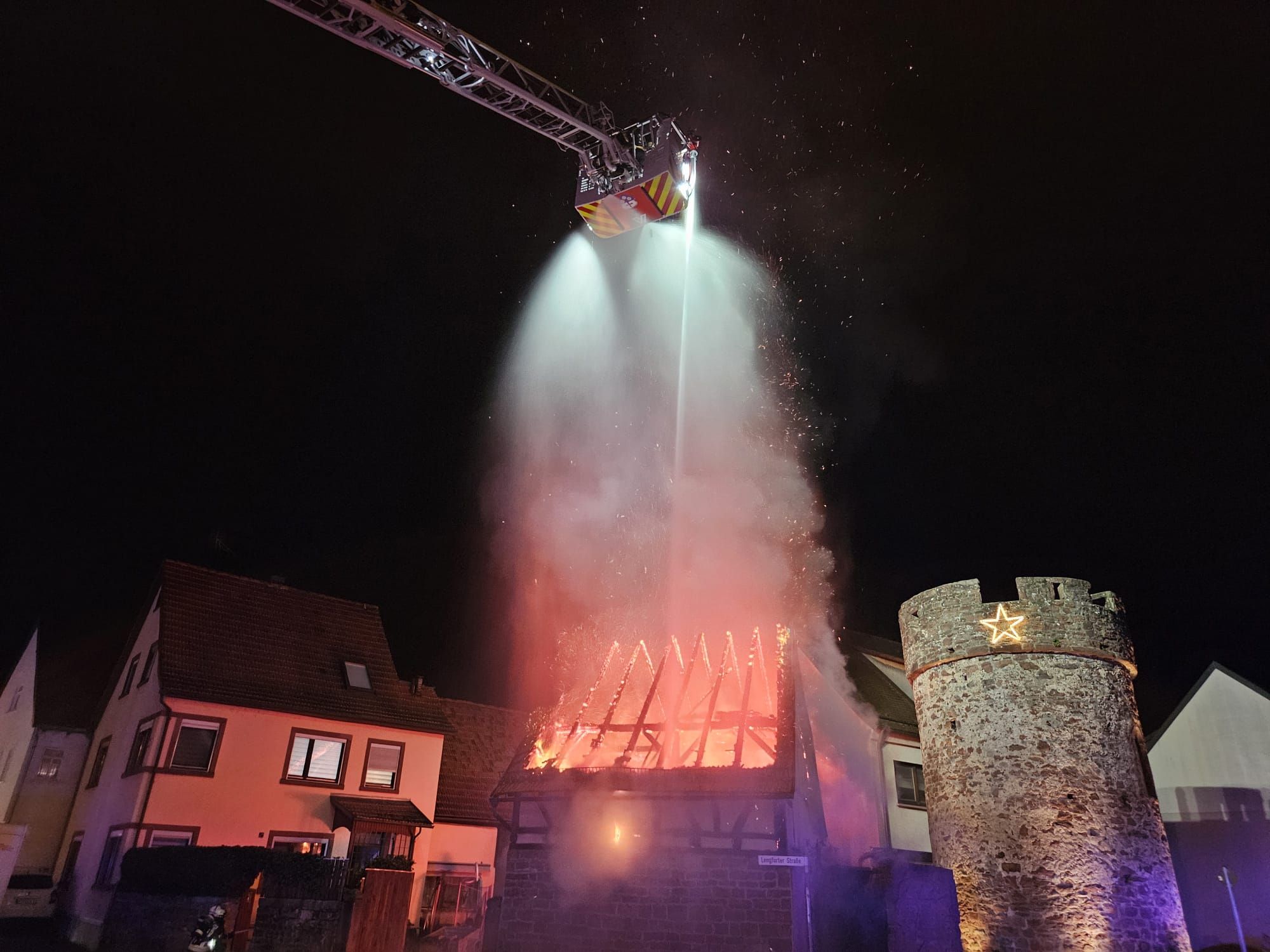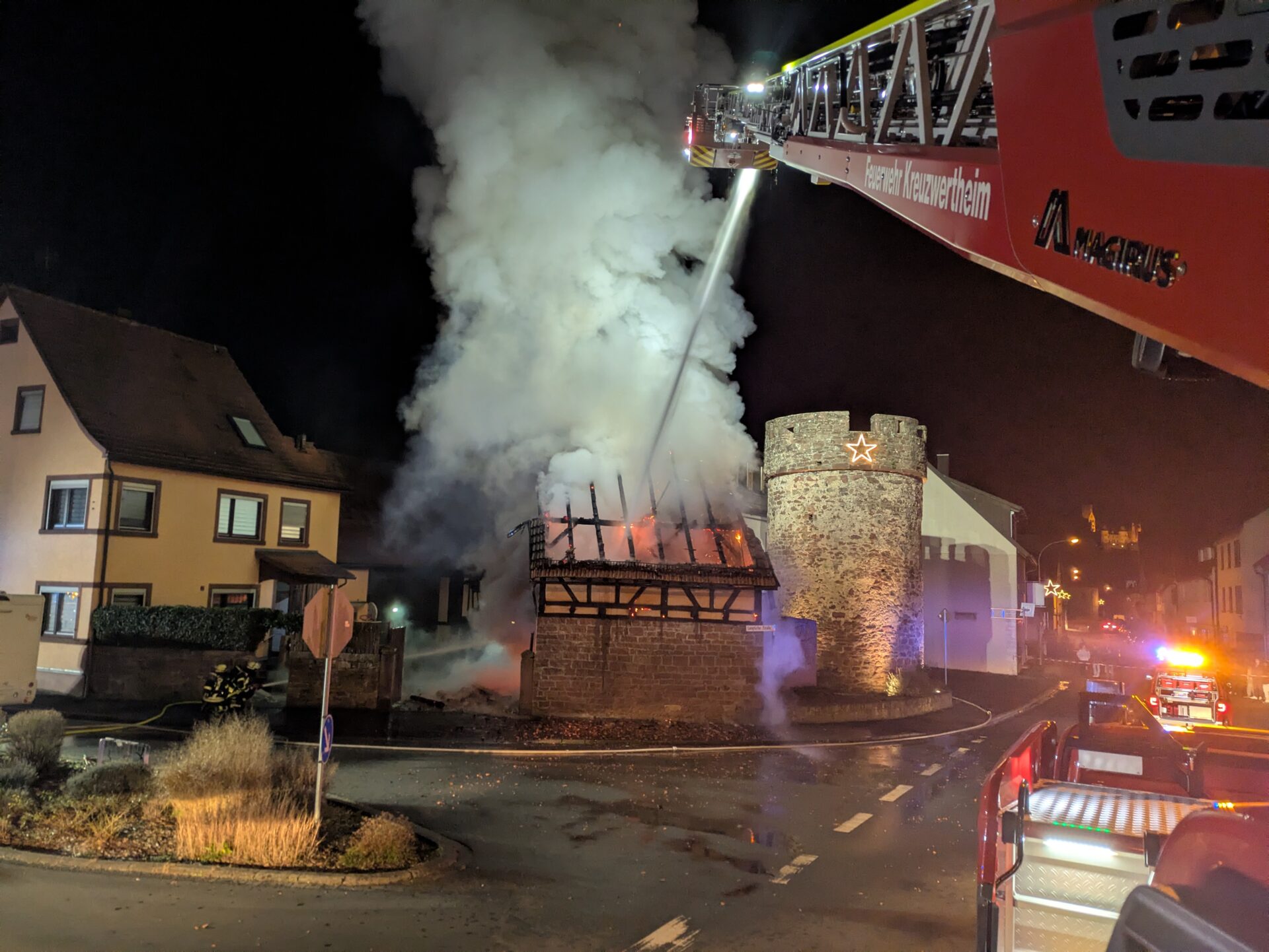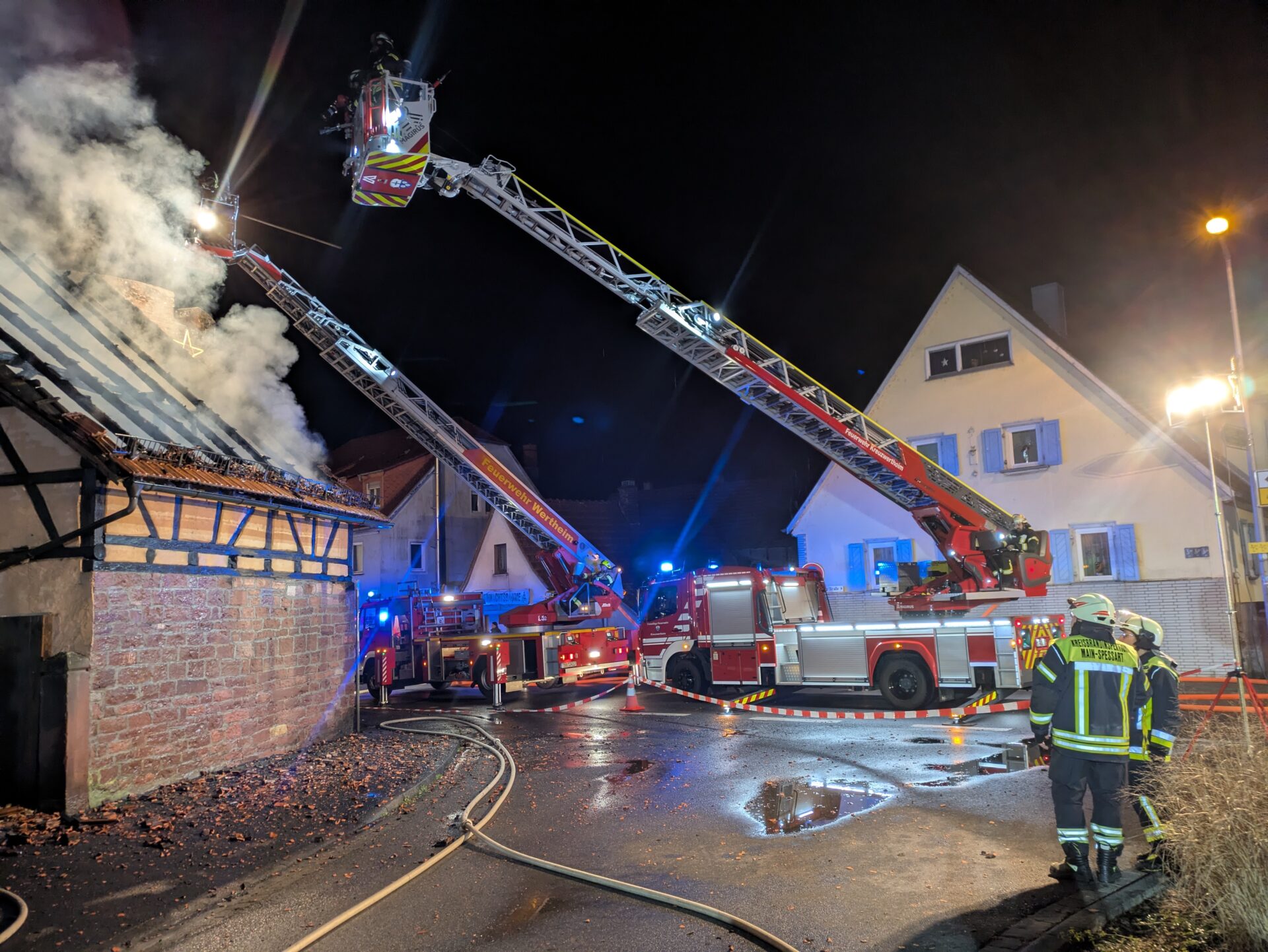 Daher wurde die Feuerwehr Wertheim mit ihrer Drehleiter nachalarmiert, um mit zwei Drehleitern eine Ausbreitung zu verhindern und das Feuer zu bekämpfen. Parallel wurde vom Boden aus ein gezielter Außenangriff durchgeführt. Hierbei wurden wir von der FW Hasloch, FW Röttbach und der FW Michelrieth unterstützt. Für Verkehrssicherungsmaßnahmen war zusätzlich die FW Unterwittbach im Einsatz.